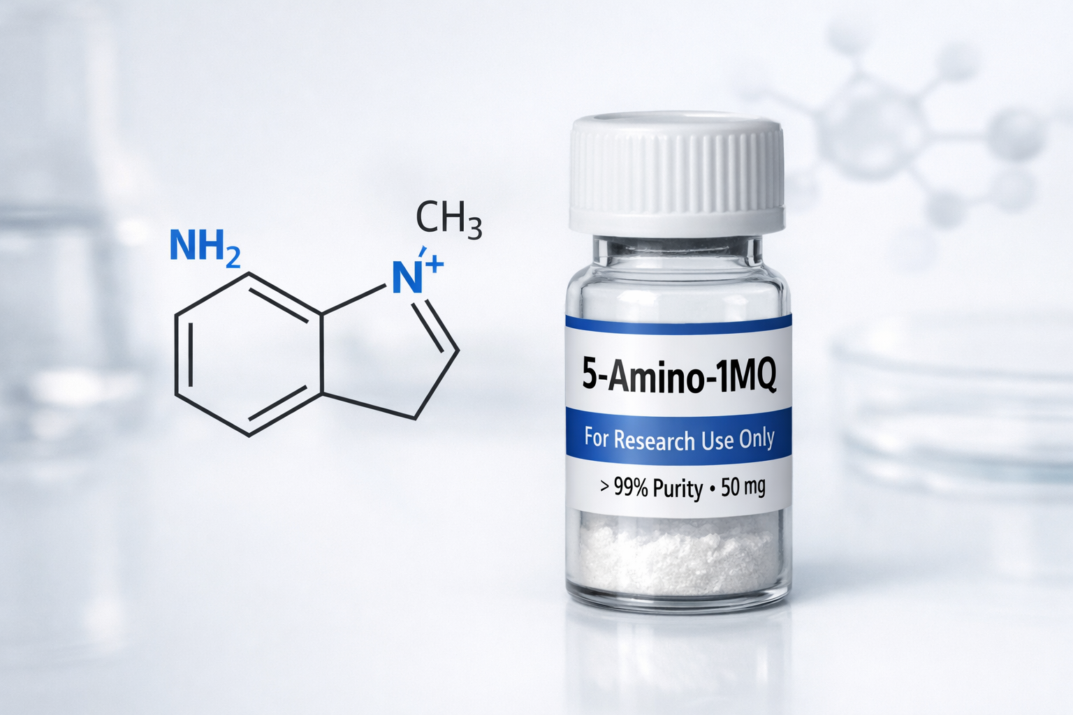 5-Amino-1-methylquinolinium (5-Amino-1MQ) is a selective NNMT inhibitor under preclinical investigation for metabolic health and weight management. By targeting cellular energy pathways, it supports NAD+ levels, enhances fat metabolism, and promotes energy expenditure. Research shows promising results in animal studies, though it is not FDA-approved for human use.