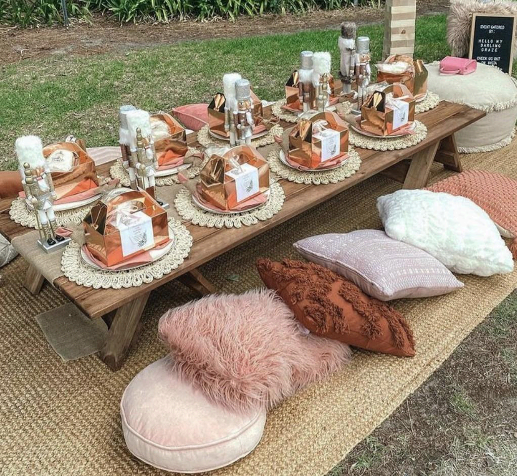 A: Each experience is designed to be effortless and unforgettable. We provide full setup and cleanup, styled décor, low tables, rugs, pillows, tableware, glassware, florals, and thoughtful touches to make your picnic picture-perfect. You simply arrive and enjoy.